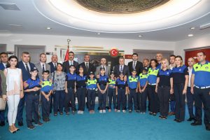 Büyükşehir Belediyesi Zabıta Daire Başkanı Bayram Kadir Tüylü ve zabıta personeli ile beraberlerindeki çocuklar, Vali Demirtaş’a Zabıta Haftası anısına çiçek verip, şükran plaketi takdim etti.