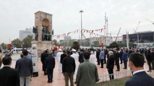 İBB Mehteran Bölüğü’nün bir dinleti sunduğu törende, alanın belli noktalarına konumlandırılan performans sanatçıları, özel makyajlarıyla Kurtuluş Savaşı’nın sembol isimlerini canlandırdı. İmamoğlu, Taksim Meydanı’ndaki törenin ardından, İstanbul Sanayi Odası’nın Odakule’deki binasında katılacağı İstanbul Kalkınma Ajansı Ekim Ayı Yönetim Kurulu Toplantısı’na, İstiklal Caddesi üzerinden yürüyerek gitti. Yol boyu vatandaşlarla selamlaşan İmamoğlu, yurttaşlardan gelen fotoğraf çektirme isteklerini geri çevirmedi.