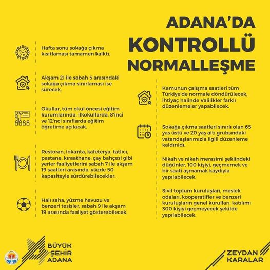 Adana Büyükşehir Belediyesi Adana’da kısıtlamaların kaldırılması ve kontrollü normalleşmeye geçilmesi üzerine halkı bilgilendirdi.