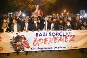Resepsiyonun ardından Adana Büyükşehir Belediyesi önünden Uğur Mumcu Meydanı’na kadar meşaleli yürüyüş yapıldı. “Bazı borçlar ödenemez” yazılı pankart taşıyan kortej, Uğur Mumcu Meydanı’na kadar coşkuyla yürüdü.