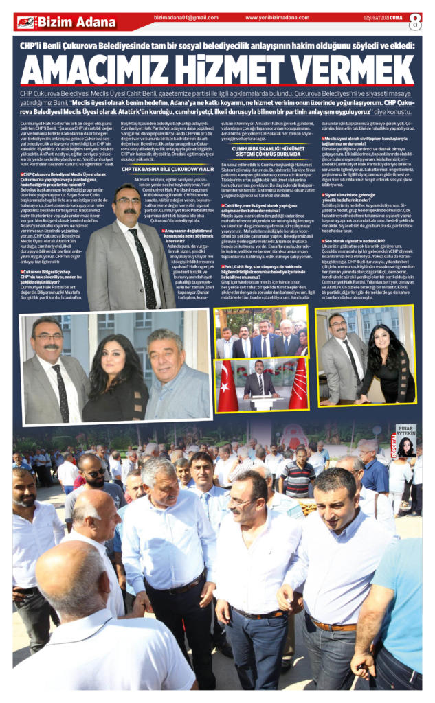 CHP Çukurova Belediyesi Meclis Üyesi Cahit Benli, gazetemize partisi ile ilgili açıklamalarda bulundu. Çukurova Belediyesi’ni ve siyaseti masaya yatırdığımız Benli, “Meclis üyesi olarak benim hedefim, Adana’ya ne katkı koyarım, ne hizmet veririm onun üzerinde yoğunlaşıyorum. CHP Çukurova Belediyesi Meclis Üyesi olarak Atatürk’ün kurduğu, cumhuriyetçi, ilkeli duruşuyla bilinen bir partinin anlayışını uyguluyoruz” diye konuştu.
