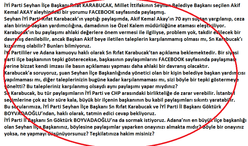 İyi Parti Seyhan İlçe Başkanı Rıfat Karabucak, Yeni Bizim Adana Gazetesi’nin 30 Mayıs 2019 tarihli haberine sosyal medya üzerinden cevap verdi.