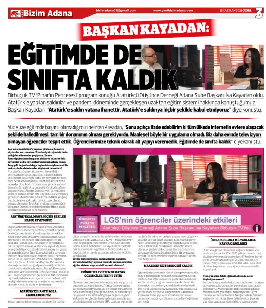 Birbuçuk TV ‘Pınar’ın Penceresi’ program konuğu Atatürkçü Düşünce Derneği Adana Şube Başkanı İsa Kayadan oldu. Atatürk’e yapılan saldırılar ve pandemi döneminde gerçekleşen uzaktan eğitim sistemi hakkında konuştuğumuz Başkan Kayadan, “Atatürk’e saldırı vatana ihanettir. Atatürk’e saldırıya hiçbir şekilde kabul etmiyoruz” diye konuştu.