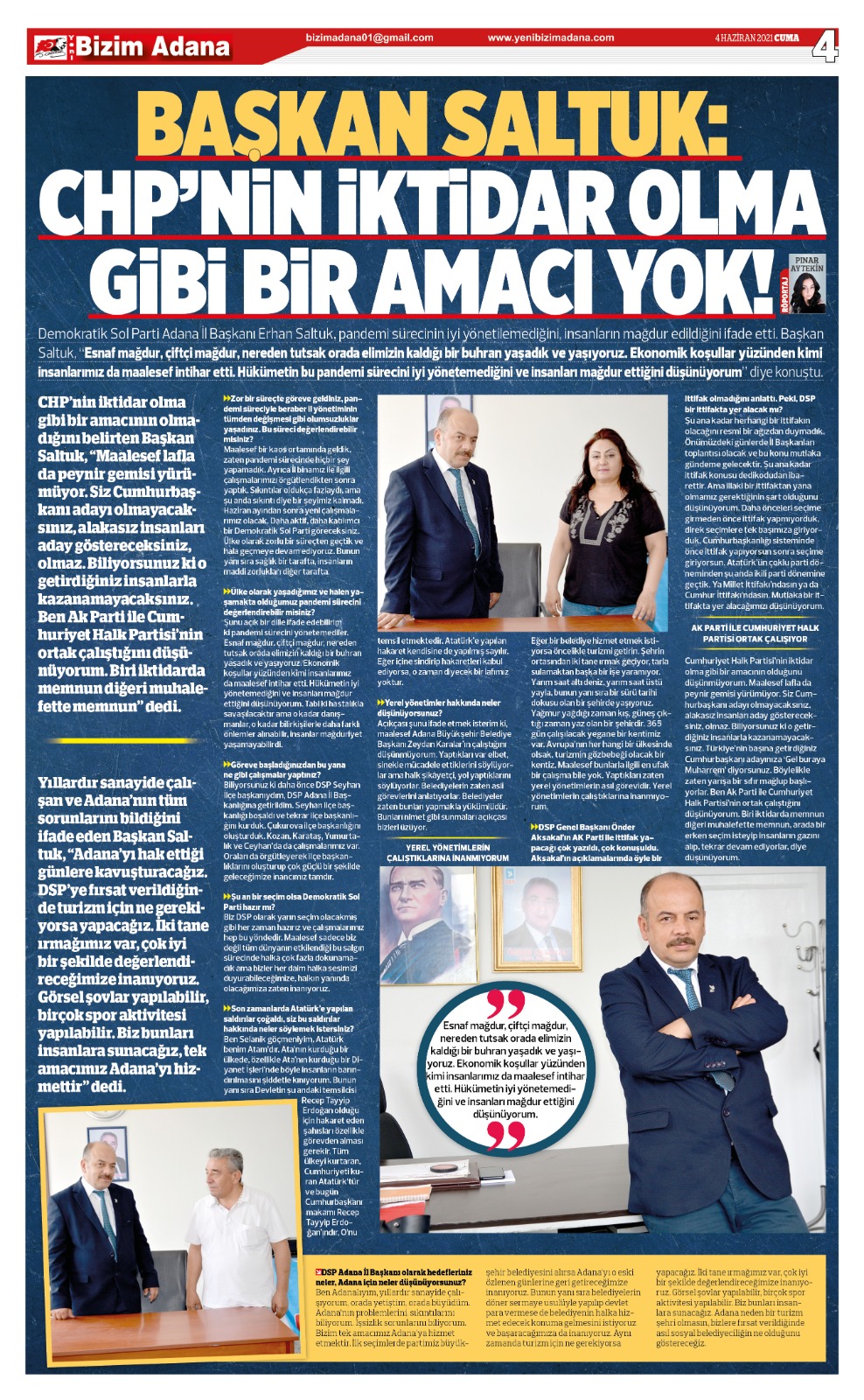Demokratik Sol Parti Adana İl Başkanı Erhan Saltuk, pandemi sürecinin iyi yönetilemediğini, insanların mağdur edildiğini ifade etti. Başkan Saltuk, “Esnaf mağdur, çiftçi mağdur, nereden tutsak orada elimizin kaldığı bir buhran yaşadık ve yaşıyoruz. Ekonomik koşullar yüzünden kimi insanlarımız da maalesef intihar etti. Hükümetin bu pandemi sürecini iyi yönetemediğini ve insanları mağdur ettiğini düşünüyorum” diye konuştu.