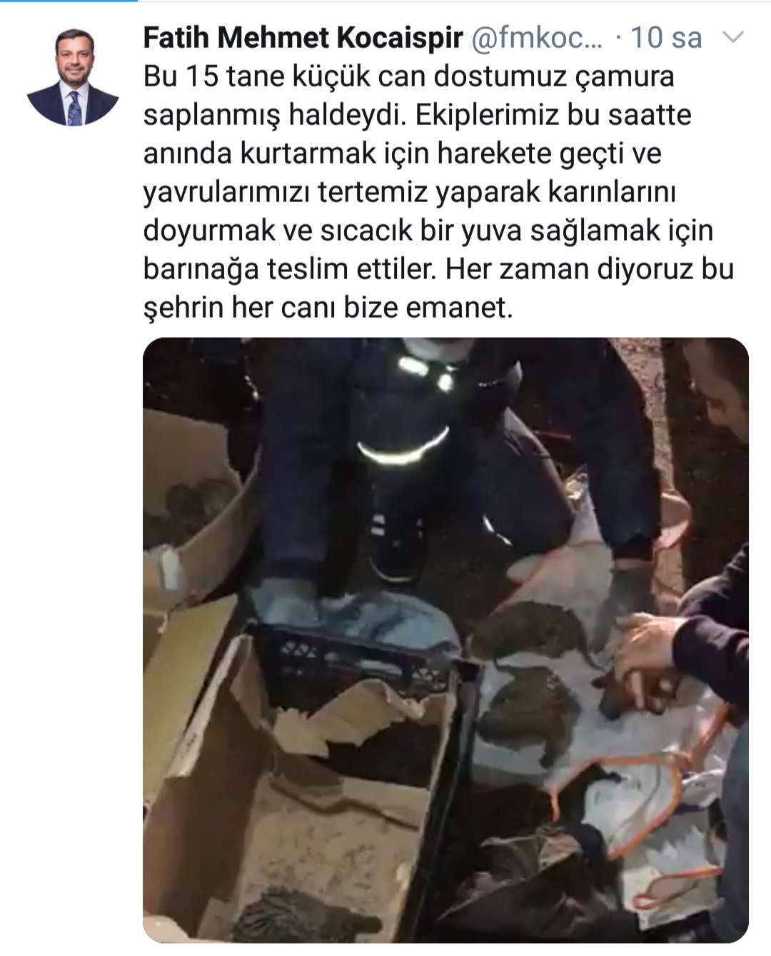 Yüreğir Belediye Başkanı Fatih Mehmet Kocaispir’in “Bu 15 tane küçük can dostumuz çamura saplanmış haldeydi. Ekiplerimiz bu saatte anında kurtarmak için harekete geçti ve yavrularımızı tertemiz yaparak karınlarını doyurmak ve sıcacık bir yuva sağlamak için barınağa teslim ettiler. Her zaman diyoruz bu şehrin her canı bize emanet.” şeklindeki sosyal medya paylaşımı ve gece yarısı seferberliği vatandaşların takdirini topladı.