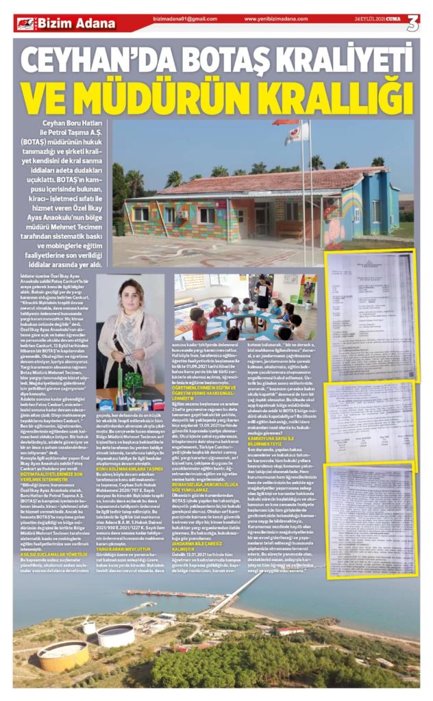Ceyhan Boru Hatları ile Petrol Taşıma A.Ş. (BOTAŞ) müdürünün hukuk tanımazlığı ve şirketi kraliyet kendisini de kral sanma iddiaları adeta dudakları uçuklattı. BOTAŞ’ın kampusu içerisinde bulunan, kiracı- işletmeci sıfatı ile hizmet veren Özel İlkay Ayas Anaokulu’nun bölge müdürü Mehmet Tecimen tarafından sistematik baskı ve mobinglerle eğitim faaliyetlerine son verildiği iddialar arasında yer aldı.