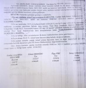 Bu süreç böyle devam ederken tarafımızca konu adli makamlara taşınmış, Ceyhan Sulh Hukuk Mahkemesi 2020/707 E. Sayılı dosyası ile kiracılık ilişkisinin tespiti vs. konulu dava açılarak bu dava kapsamında tahliyenin önlenmesi ile ilgili tedbir talep edilmiştir. Bu talebimiz ile ilgili bir üst mahkeme olan Adana B.A.M. 5.Hukuk Dairesi 2021/930 E.2021/1227 K. Sayılı ilam sonucu dava sonuna kadar tahliyenin önlenmesi hususunda mahkeme kararı çıkmıştır.