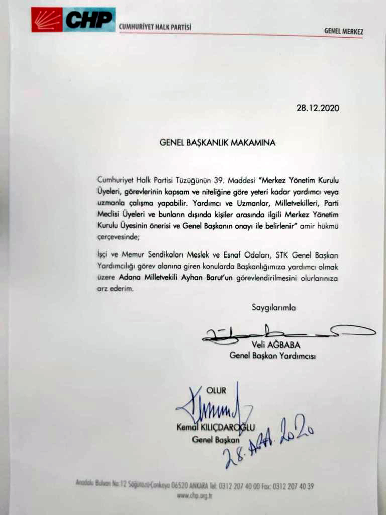 Cumhuriyet Halk Partisi (CHP) Genel Başkanı Kemal Kılıçdaroğlu, Adana Milletvekili Ayhan Barut’u önemli bir göreve atadı. CHP Genel Başkan Yardımcısı Veli Ağbaba’nın başkanlığını yürüttüğü İşçi ve Memur Sendikaları, Meslek ve Esnaf Odaları, STK Genel Başkan Yardımcılığı bünyesinde görevlendirilen Ayhan Barut, “Partimiz ve halkımızın hizmetinde, iktidara ulaşmak için gece gündüz demeden var gücümüzle çalışıyoruz” dedi.