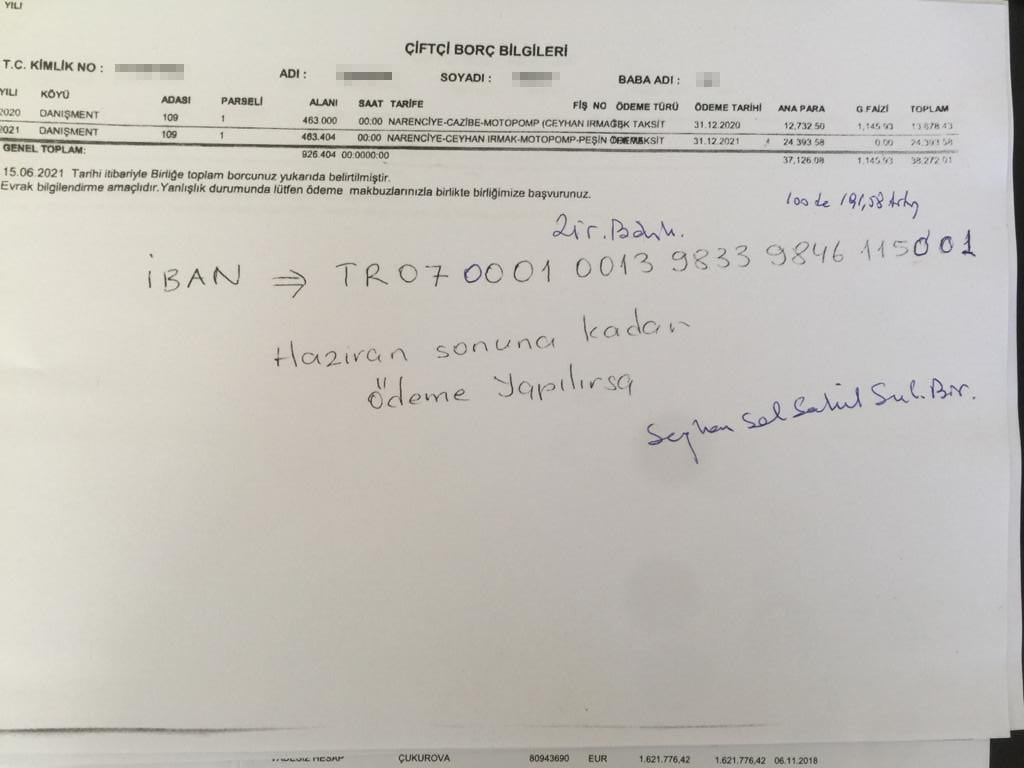 Adana’nın Ceyhan İlçesi’nde geçen yıl sulama ücreti olarak 12 bin 732 lira sulama ücreti ödeyen bir çiftçiye bu sene aynı yer için 24 bin 393 liralık borç çıkarıldığını belirten ve belgelerini paylaşan Barut, şunları kaydetti: