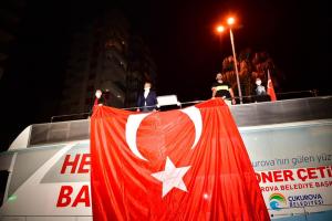 Saatler 21:00’i gösterdiğinde Çukurova’da coşku zirveye çıktı. Çukurova Belediye Başkanı Soner Çetin, otobüsün üzerine çıkarak İstiklal Marşı’nı vatandaşlarla birlikte büyük bir coşkuyla söyledi. İstiklal Marşı öncesi Büyük Önder Atatürk ve şehitler için 1 dakikalık saygı duruşunda bulunuldu.