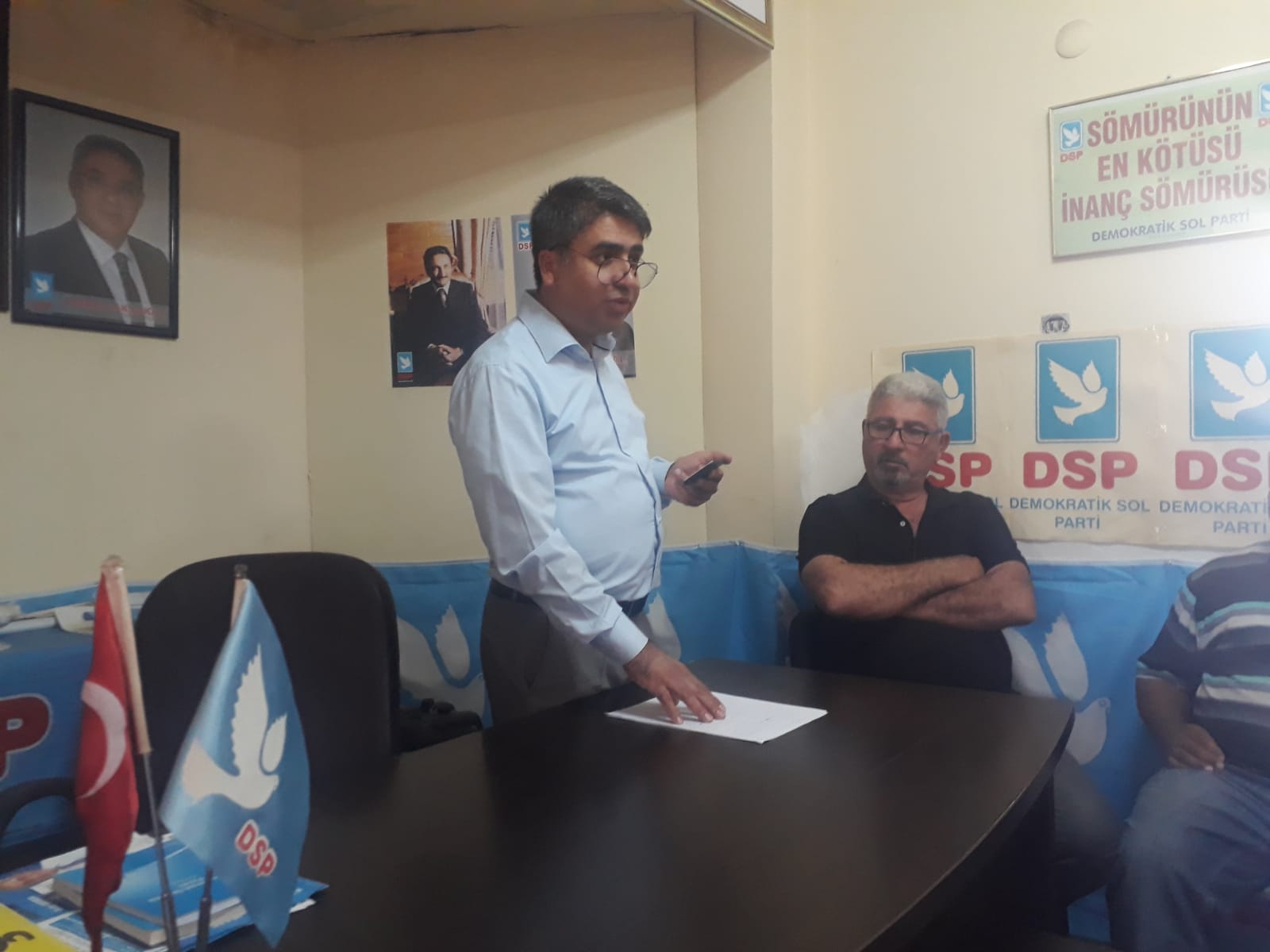 “Biz bugün Demokratik Sol Partililer olarak sadece Seyhan İlçe kongresi için değil, 17 yıl boyunca, 2 trilyon dolar vergi toplayıp 70 milyar dolar özelleştirme geliri elde edip üstüne bir de 500 milyar dolar borç alan fakat bugün halkın çoğunluğunu yoksul bırakan haramzadelerden tüyü bitmemiş yetimin hakkını korumak için buradayız.