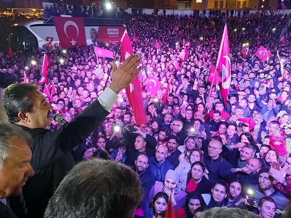 Adana’da Büyükşehir Belediye Başkanlığı’nı kazanan Zeydan Karalar’ı destekleyen vatandaşlar ellerine Türk bayrağı alarak Seyhan Belediyesi önünde toplanıp meşaleler yakıp sloganlar attı. Kendisini bekleyen kalabalığı beraberindeki adaylar, milletvekilleri ve ailesi ile selamlayan Karalar, şunları söyledi: