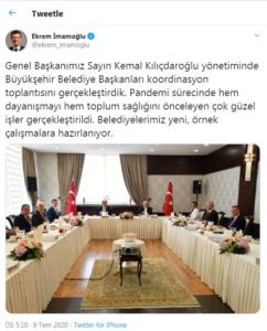 İmamoğlu yaptığı paylaşımda şu ifadelere yer verdi: “Genel Başkanımız Sayın Kemal Kılıçdaroğlu yönetiminde Büyükşehir Belediye Başkanları koordinasyon toplantısını gerçekleştirdik. Pandemi sürecinde hem dayanışmayı hem toplum sağlığını önceleyen çok güzel işler gerçekleştirildi. Belediyelerimiz yeni, örnek çalışmalara hazırlanıyor.”
