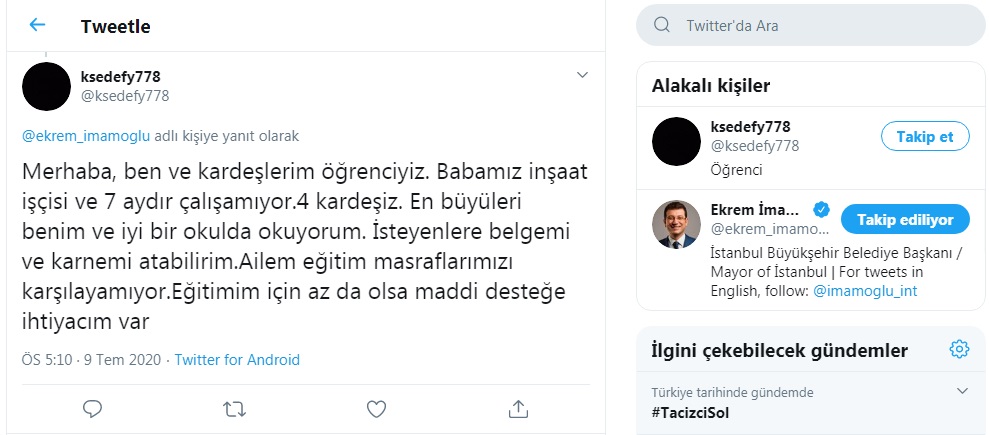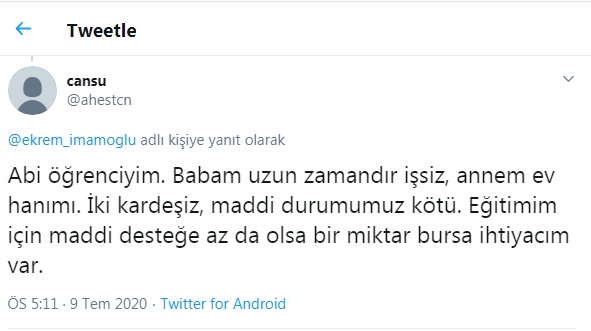 “Abi öğrenciyim. Babam uzun zamandır işsiz, annem ev hanımı. İki kardeşiz, maddi durumumuz kötü. Eğitimim için maddi desteğe az da olsa bir miktar bursa ihtiyacım var.”