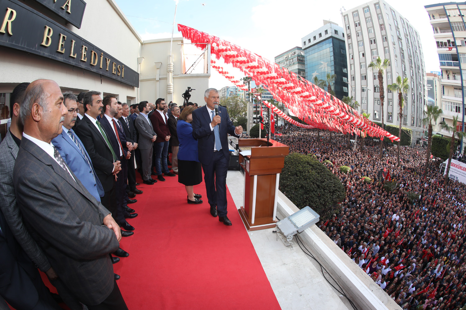 Adana Büyükşehir Belediye Başkanı Zeydan Karalar, devir teslim törenindeki konuşmaların ardından belediye binasının balkonuna çıkarak, kendisini dışarıda büyük coşkuyla bekleyen on binlerce Adanalıya hitap etti.