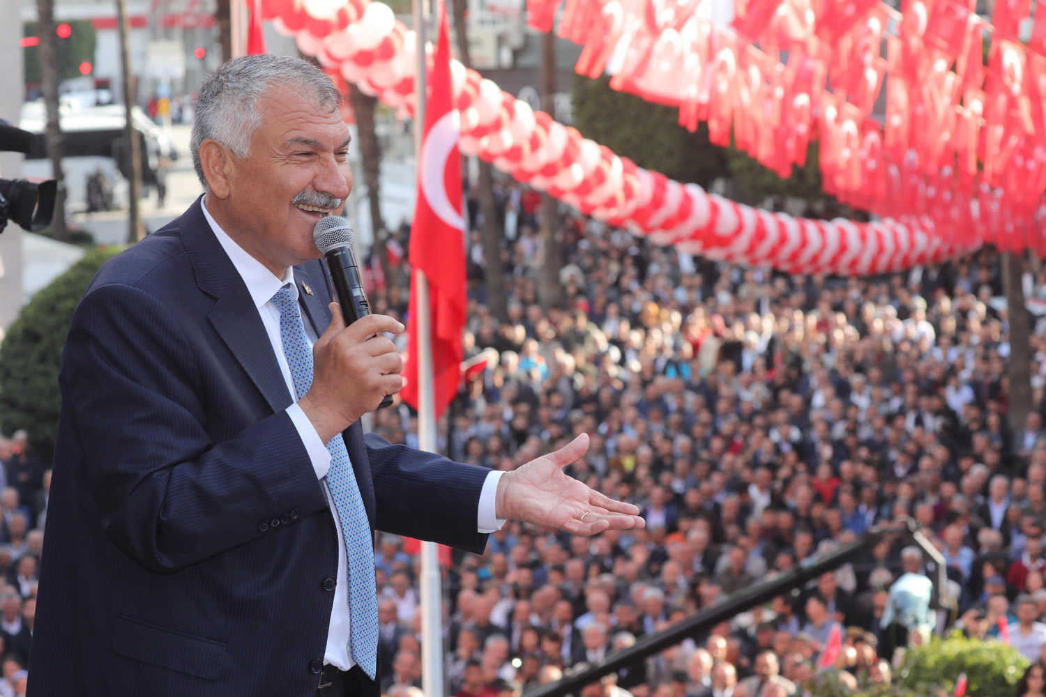 Adana Büyükşehir Belediye Binası önünde toplanan ve Başkan Karalar’ı, “Halkçı “Zeydan sloganlarıyla karşılayan Adanalılara hitap eden Başkan Zeydan Karalar