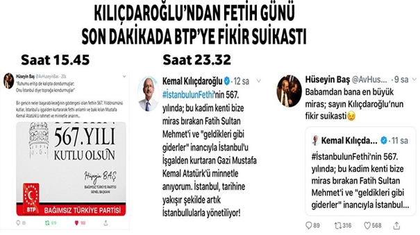 Fetih gününün son dakikalarında saatler 23.30’u gösterdiğinde CHP genel başkanı Kemal Kılıçdaroğlu adeta taklit bir tweet atarak ”İstanbulun Fethi’nin 567. yılında; bu kadim kenti bize miras bırakan Fatih Sultan Mehmet’i ve ‘geldikleri gibi giderler’ inancıyla İstanbul’u İşgalden kurtaran Gazi Mustafa Kemal Atatürk’ü minnetle anıyorum. İstanbul, tarihine yakışır şekilde artık İstanbullularla yönetiliyor!” dedi.