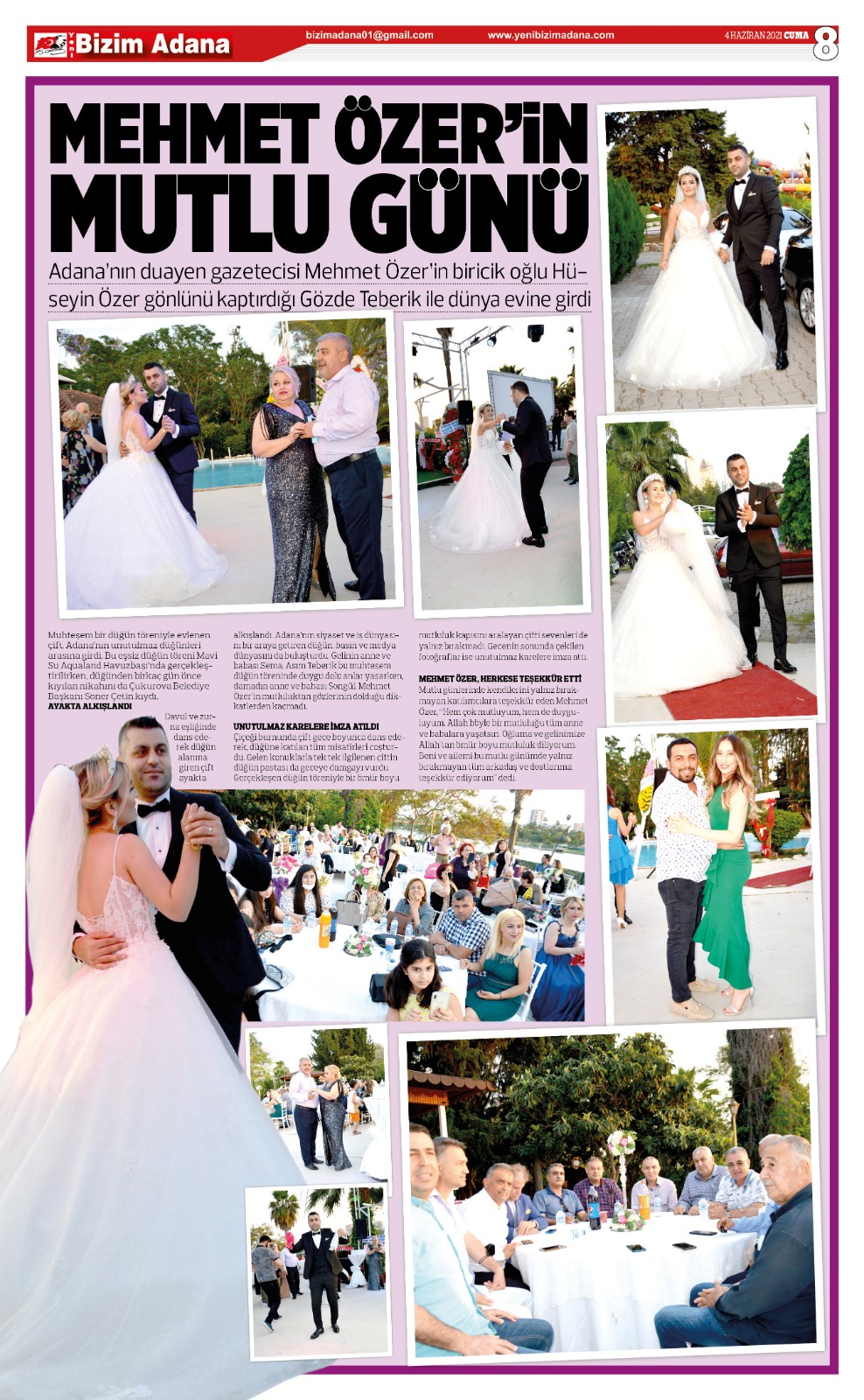 Adana’nın duayen gazetecisi Mehmet Özer’in biricik oğlu Hüseyin Özer gönlünü kaptırdığı Gözde Teberik ile dünya evine girdi. Muhteşem bir düğün töreniyle evlenen çift, Adana’nın unutulmaz düğünleri arasına girdi. Bu eşsiz düğün töreni Mavi Su Aqualand Havuzbaşı’nda gerçekleştirilirken, düğünden birkaç gün önce kıyılan nikahını da Çukurova Belediye Başkanı Soner Çetin kıydı.