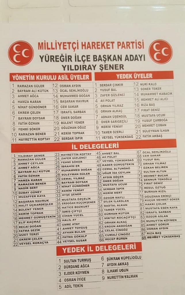 13. Olağan Kongrelerini tamamlayan Milliyetçi Hareket Partisi Yüreğir İlçe’de tek liste çıkarıldı. Buna göre mevcut Başkan Yıldıray Şener yeniden MHP Yüreğir İlçe Başkanı görevine seçildi.