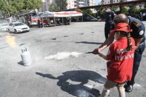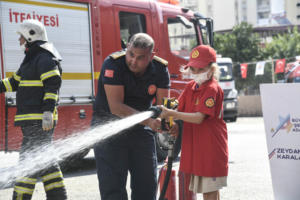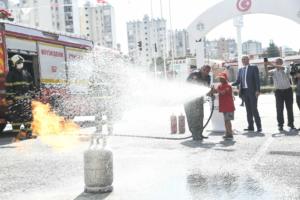 Başkan Zeydan Karalar’ın konuşmasının ardından etkinlikler kapsamında öğrencilerin de katıldığı yangın tatbikatı yapıldı.