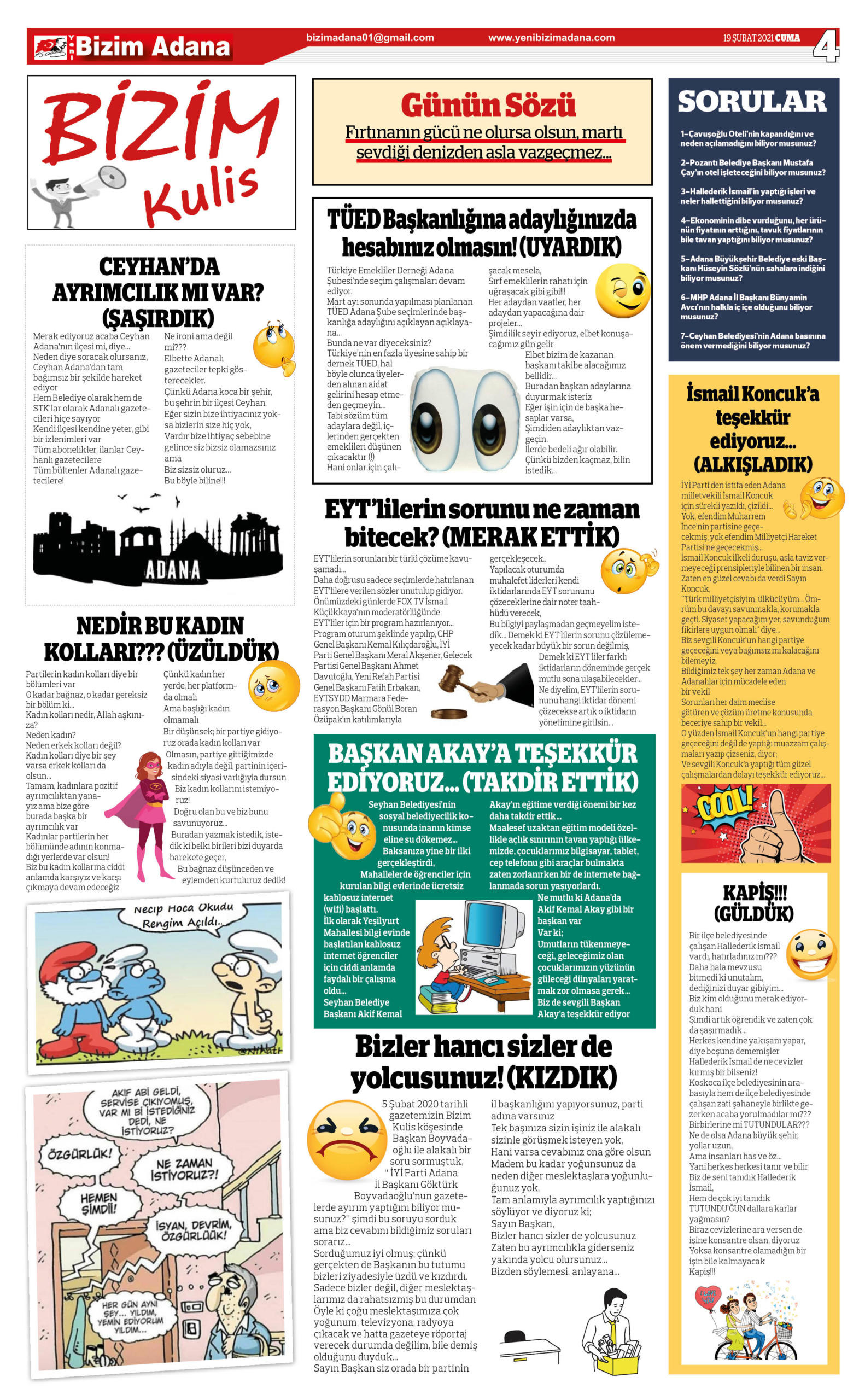 5 Şubat 2020 tarihli gazetemizin Bizim Kulis köşesinde Başkan Boyvadaoğlu ile alakalı bir soru sormuştuk, “ İYİ Parti Adana İl Başkanı Göktürk Boyvadaoğlu’nun gazetelerde ayırım yaptığını biliyor musunuz?” şimdi bu soruyu sorduk ama biz cevabını bildiğimiz soruları sorarız…