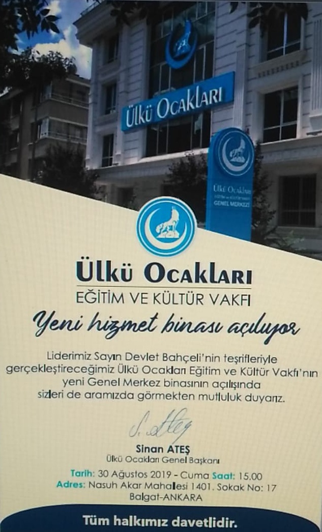 Ülkü Ocakları Eğitim ve Kültür Vakfı yeni Genel Merkezi binasının açılışı 30 Ağustos 2019’da Ankara’da MHP lideri Devlet Bahçeli eşliğinde gerçekleştirilecek.
