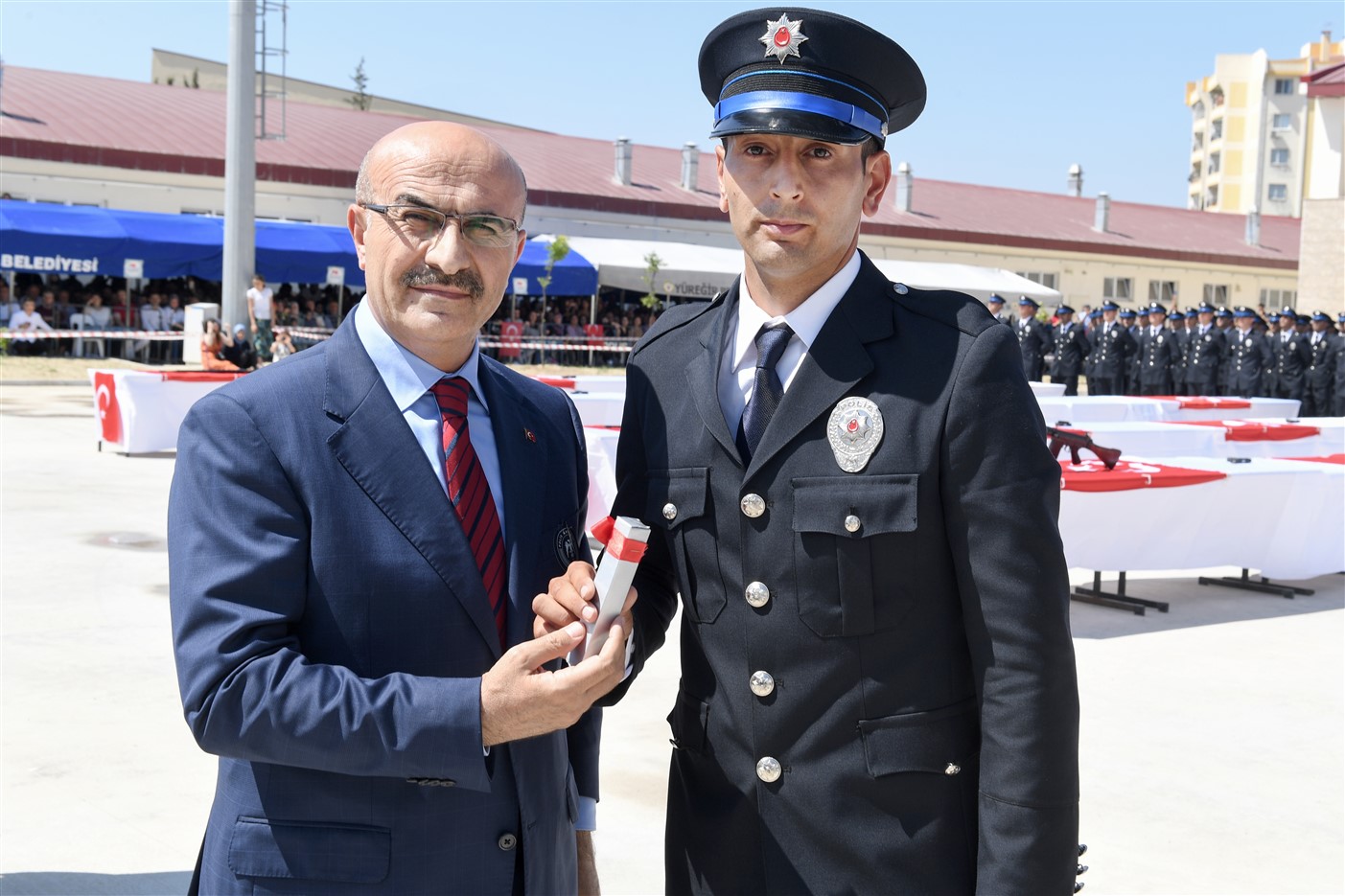 Saygı duruşu ve İstiklal Marşı’nın okunması ile başlayan törende, dönem birincisi polis memuru Necat Erensoy mezunlar adına bir konuşma yaptı. Erensoy’un yaş kütüğüne plaket çakmasının ardından ise okulu dereceyle bitiren ilk öğrenci, diplomalarını ve hediyelerini Vali Demirtaş’ın elinden aldı.