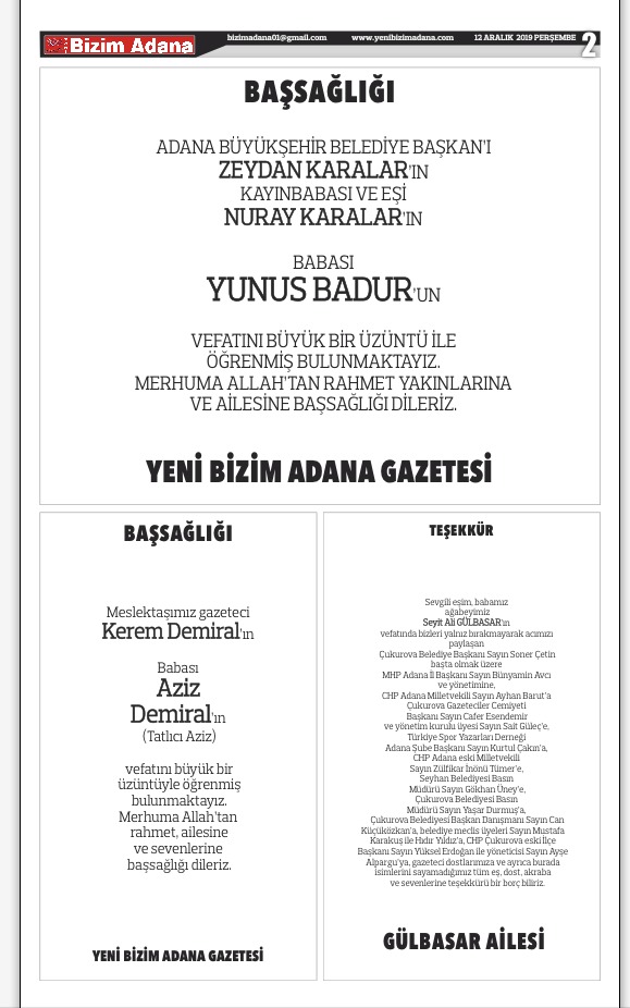 YENİ BİZİM ADANA 12 ARALIK 2019 YAYINI www.yenibizimadana.com | Yeni Bizim Adana Gazetesi Web SitesiYeni Bizim Adana Gazetesi Web Sitesi