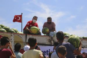 Mağdur üreticiden karpuz alan Büyükşehir Belediyesi, halka ücretsiz dağıtıyor.